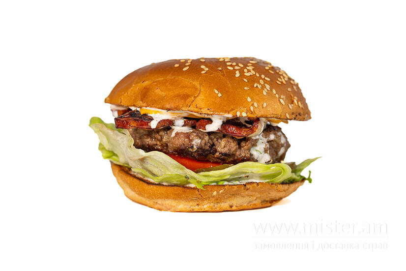 Запашна булочка Бріош, котлета з яловичини маринована в авторському маринаді, підсмажений бекон, соус Білий, соус Червоний, салат Айсберг, свіжий помідор, маринована синя цибуля, маринований огірок, подвійний сир Чеддер.