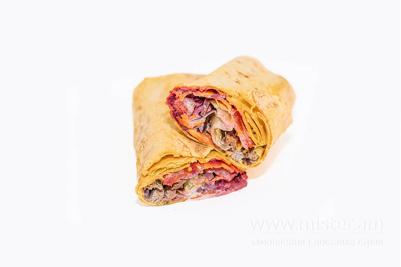 Жовтий лаваш з борошна, яловичина маринована в авторському маринаді, соус Білий, соус Червоний, морква по-корейськи, буряк по-корейськи, свіжий помідор, маринована синя цибуля, салат Айсберг, маринований огірок.