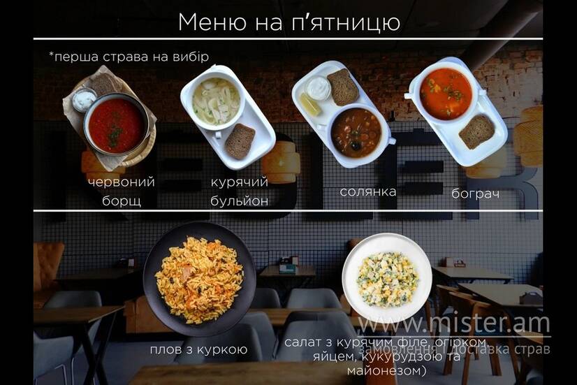 Перша страва на вибір, плов з куркою, салат з курячим філе, огірком, яйцем, кукурудзою та майонезом.