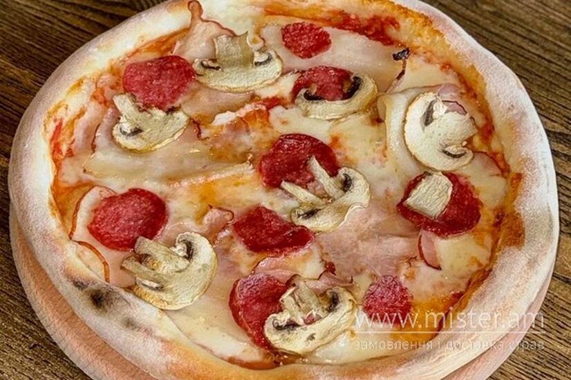 Томатний соус, моцарела, бекон, шинка, салямі, печериці.