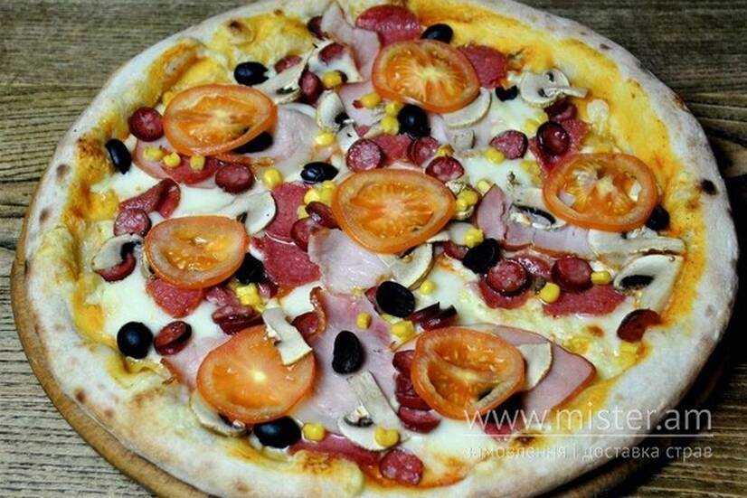 Томатний соус, вершковий соус, салямі, бекон, балик, мисливські ковбаски, печериці, маслини, кукурудза, томати, моцарела, мааздам.