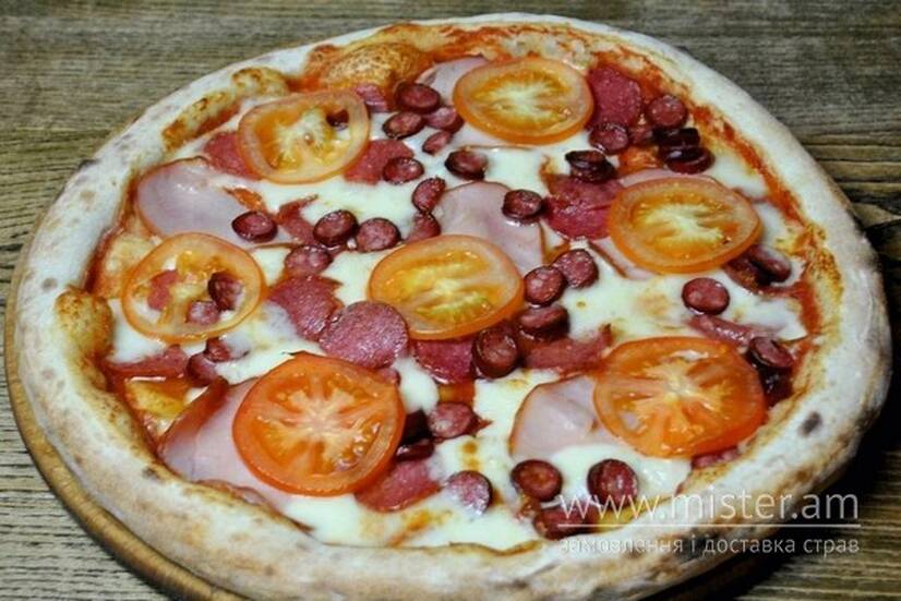 Томатний соус, балик, салямі, помідори, моцарела, мисливські ковбаски.