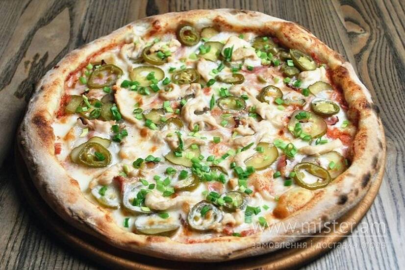 Томатний соус, бекон, куряче філе, квашений огірок, перець халапеньо, моцарелла, зелена цибуля.