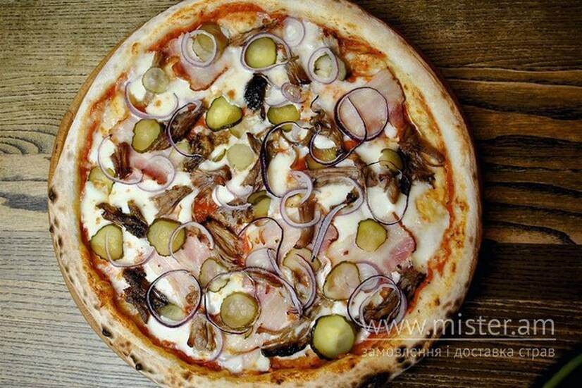 Томатний соус, рвана свинина, бекон, моцарела, солоний огірок, синя цибуля.