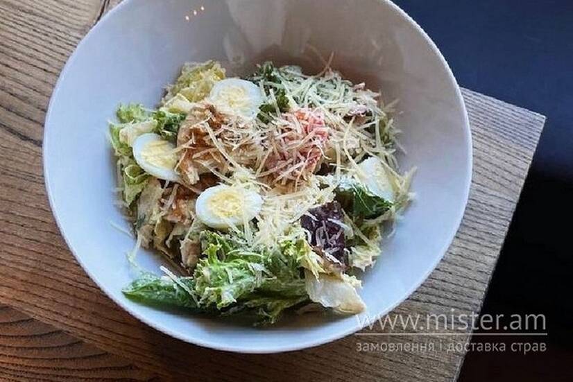 Підсмажена курка, бекон, томати, мікс салату, пармезан, грінки, яйця, соус "Цезар".