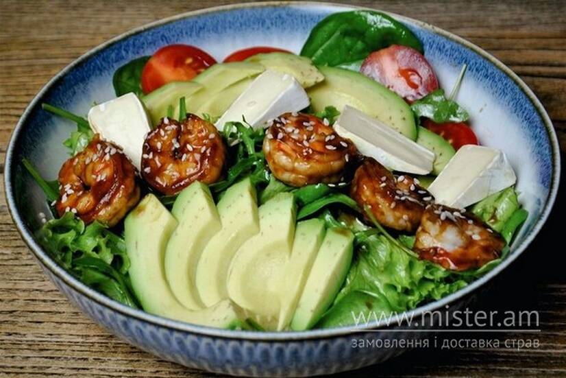 Креветки тигрові, камамбер, авокадо, помідори чері, мікс салат, оливкова олія, соус бальзамічний.