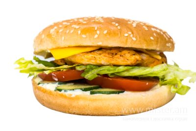 Булочка пшенична з кунжутом, соковите куряче стегно, соус Тар-Тар, хрусткий салат Айсберг, огірок свіжий, помідор свіжий, сир Чеддер.