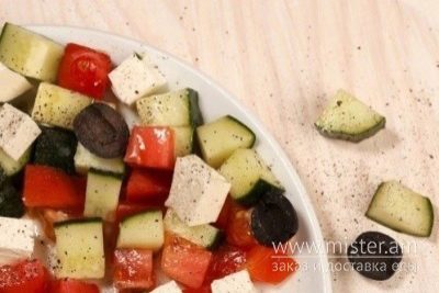 Хрусткий салат Айсберг, синя цибуля, помідори свіжі, огірок свіжий, перець болгарський, маслини, сир "Фєта", олія оливкова.
