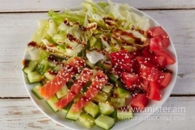 Хрусткий салат Айсберг, помідори свіжі, огірок свіжий, слабосолений лосось, кунжут білий, соус Унагі.