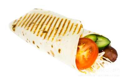 Тортилья пшенична, капуста білокачана, морква свіжа, огірок свіжий, помідор свіжий, ковбаска Баварська, соус Гірчичний.
