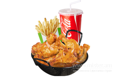 В меню дешевше, -7% !!! Складається з крильця манго-чилі 7 шт, картопля фрі стандарт, напій 0,5 (Кока-Кола/Фанта/Спрайт).