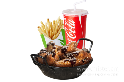 В меню дешевше, -10% !!! Складається з: крильця по-китайськи 10 шт, картопля фрі велика, напій 0,5 (Кока-Кола/Фанта/Спрайт).