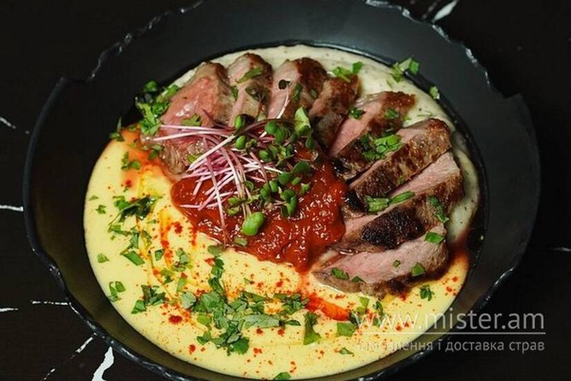 Куряче стегно на грилі з кус кусом, грибним кремом і пудрою з синьої капусти