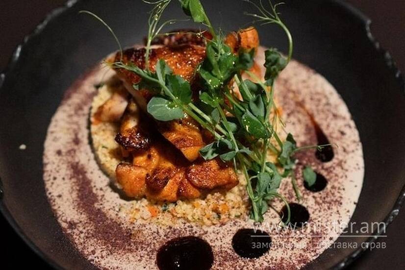 Ніжне куряче стегно, смажене з часниковим маслом, подається на легкому кус-кусі з овочами. Вершковий грибний крем та кисло-солодкий соус підкреслюють смак, а зелена цибуля, мікрогрін та пудра з синьої капусти додають вишукану нотку кольору і аромату.