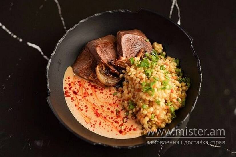 Ніжний язик, смажений на грилі з топленим вершковим маслом, подається з власноруч приготованим вершковим деміглясом, карамелізованою цибулею та жемчужним кускусом — птітім.