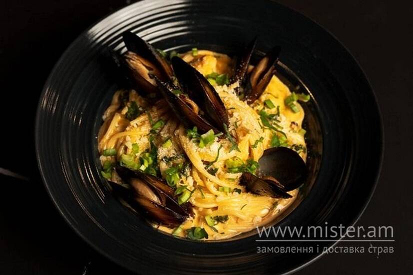 У складі страви — ніжні креветки, кальмари, бейбі-восьминоги, мідії в мушлях та лосось, приготовані в насиченому соусі на основі вершків і стиглих томатів. Завершує композицію щедра порція тертого пармезану та свіжого базиліку, що додають вишуканості та яскравого аромату.