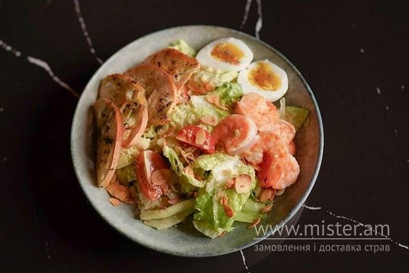 Мікс свіжого салату айсберг та рамену з томатами чері, заправлений класичним соусом "Цезар" на основі сиру пармезан та анчоусів. Подається із креветками на грилі, ідеальним яйцем, хрусткими сухариками з чіабати, обжареними мигдальними пластівцями та щедрою порцією тертого пармезану для завершеного смаку.