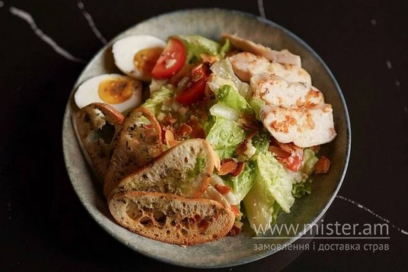 Вишуканий мікс свіжого салату айсберг та рамену з томатами чері, заправлений класичним соусом "Цезар" на основі сиру пармезан та анчоусів. Подається з ніжною куркою су-віду, ідеальним яйцем, хрусткими сухариками з чіабати, обсмаженими мигдальними пластівцями та тертим пармезаном.