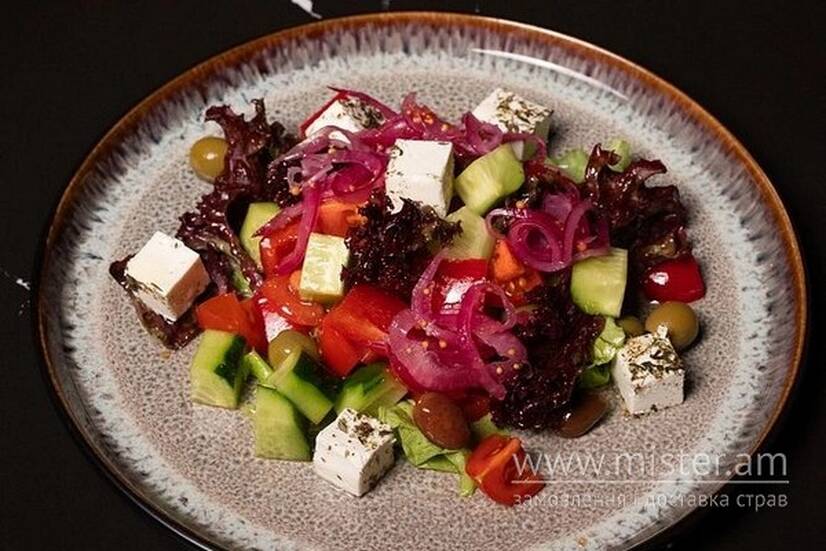 Свіжий мікс салату з огірками, соковитими томатами чері, болгарським перцем та маринованою синьою цибулею, поєднаний з оливками та ніжним сиром "Фета". Заправлений оливковою олією, соєвим соусом, бальзамічним оцтом та діжонською гірчицею, з ароматними прованськими травами.
