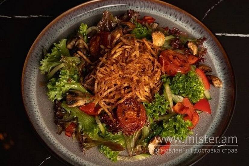 Свіжий мікс салату з огірком, заправлений бальзамічною заправкою, доповнений ніжною телятиною, обжареною на грилі з томатами чері, болгарським перцем та грибами. Подається на кремі з сиру дорблю з вершками та тим`яном, а зверху посипається хрусткою картоплею пай для додаткової текстури та аромату.
