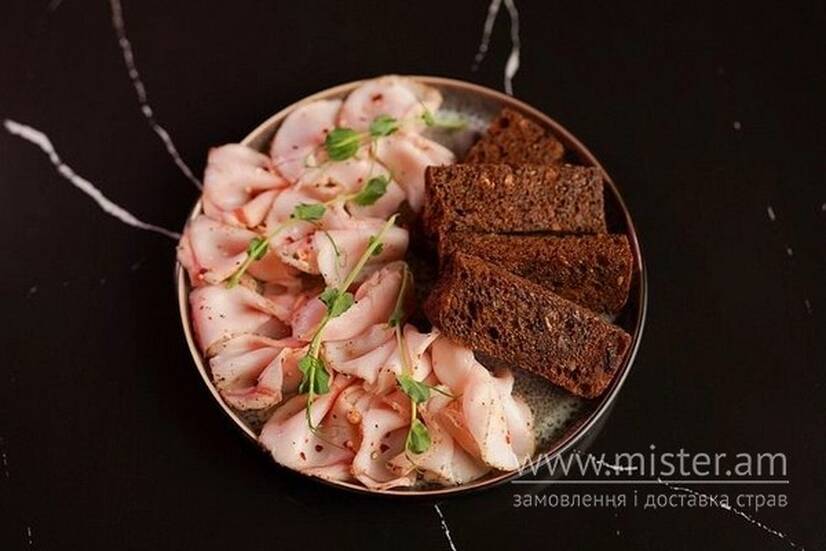 Фермерське сало з чорним хлібом, смаженим на грилі з часниковим маслом, подається з гірчицею.