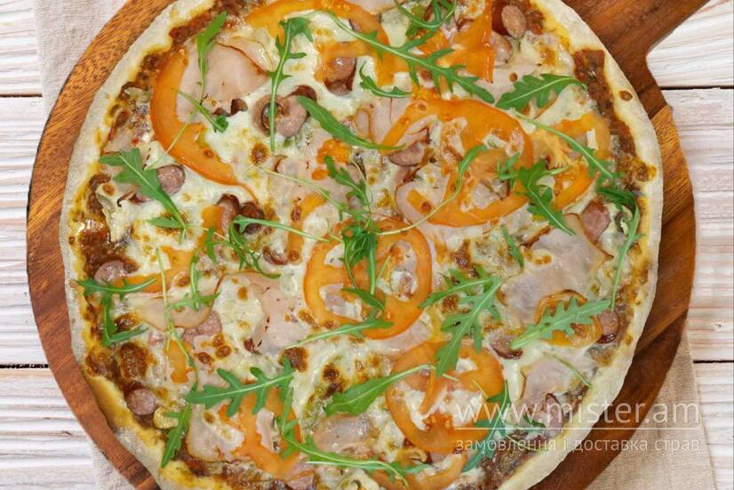 Соус пілаті, моцарела, гриби, шинка, ковбаски мисливські, цибуля маринована, помідора, зелень