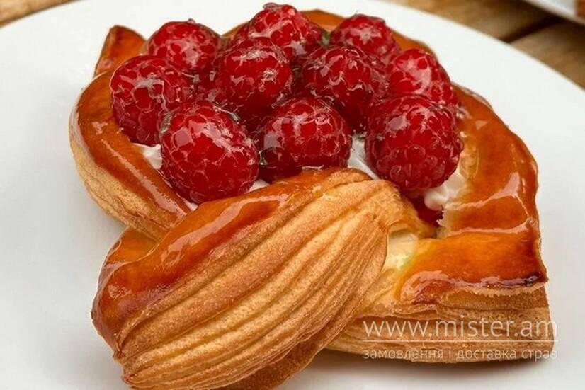 Листкове тістечко з кремом патісьєр, малиновим кюлі, чіз кремом та відбірною свіжою малиною.
