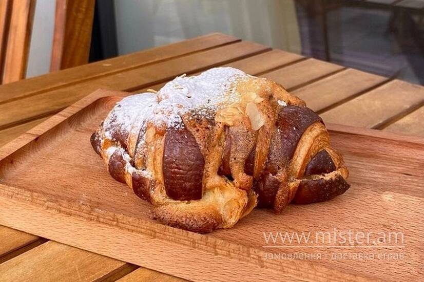 Масляний круасан подвійного запікання з мигдалевою начинкою (франжипаном) та паличкою бельгійського шоколаду.