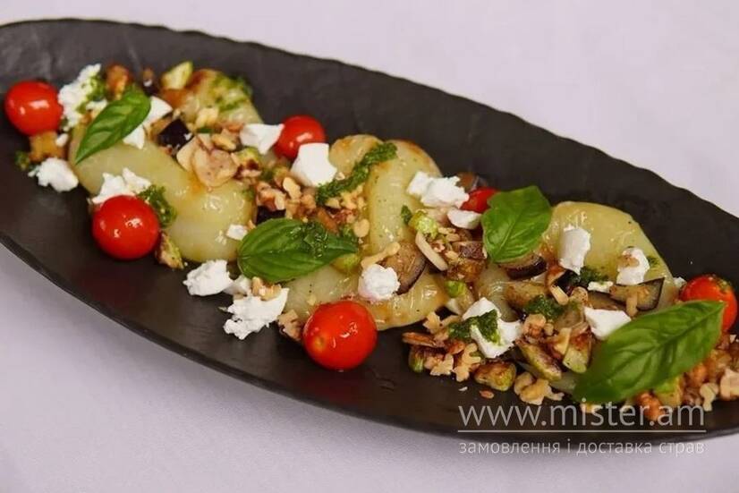 Перець, томати, баклажани, сир фета, грецький горіх.