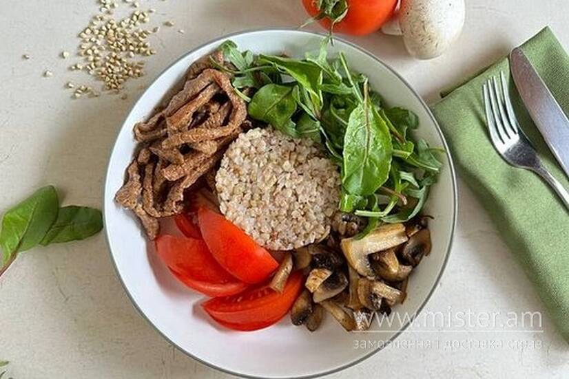Зелена гречка, печериці, томати, рукола.