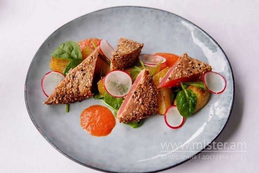 Тунець з молодою картоплею та перечним соусом