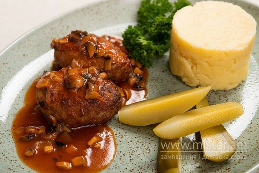 Подаються в томатно-грибному соусі з карторляним пюре і квашеними огірками