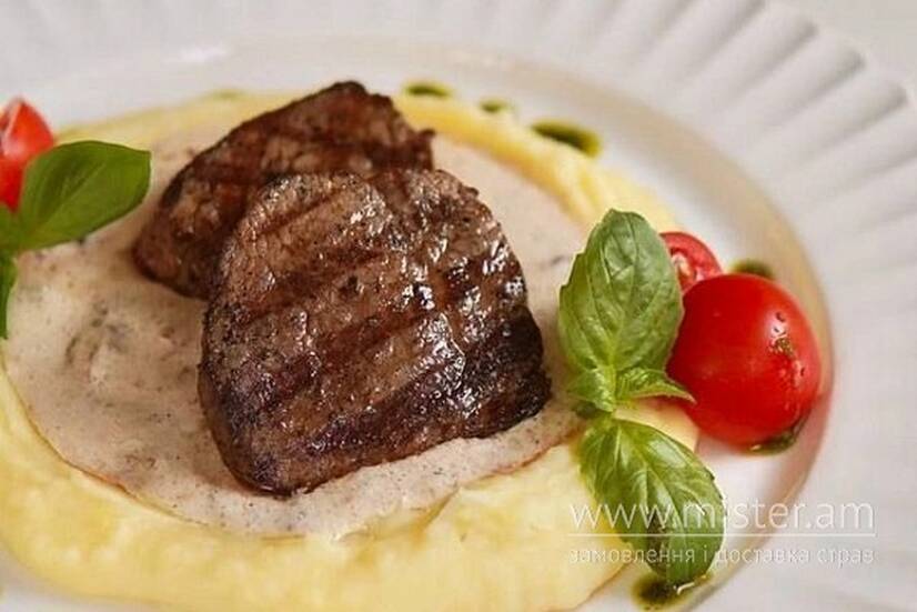 Філе телятини в соусі з білих грибів, подається з картопляним пюре. Вагова страва. Ціна страви може відрізнятися залежно від його кінцевої ваги