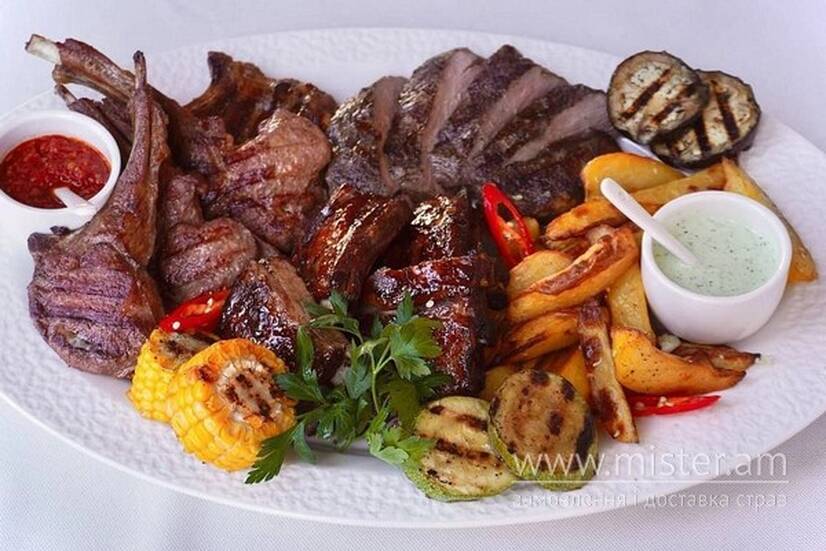 Каре теляче, стейк Рибай, реберця зі свинини, овочі гриль, печена картопля.