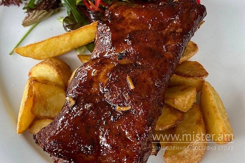 Запечені свинячі реберця з картопляними діпами під соусом BBQ. Вагова страва.
