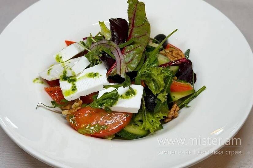 Салат овочевий з пісним сиром фета та соусом грін
