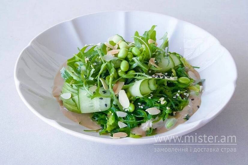 Авокадо, боби едамаме, чука, рукола, огірок. Подається на горіховому соусі.
