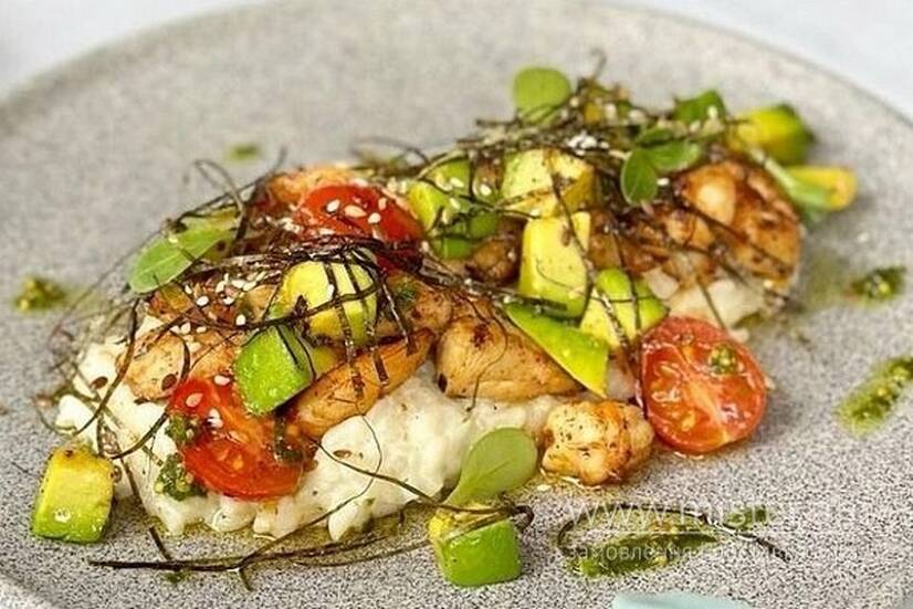 Ризото вершкове з сиром Пармезан, смаженими креветками та курячою грудкою