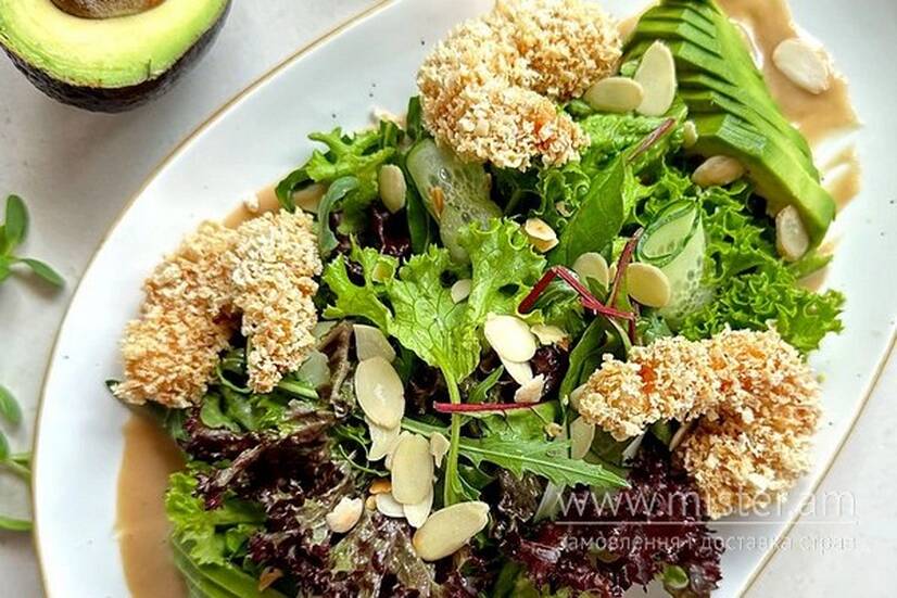 Наомі Салат з креветкою темпура, авокадо та горіховим соусом