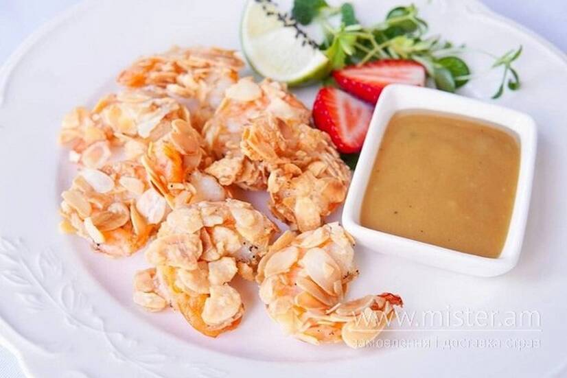 Тигрові креветки в мигдальних хлопях з медово-гірчичним соусом