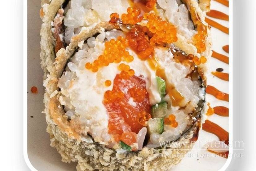 Лосось, ікра тобіко, сир вершковий, огірок, авокадо, соус унагі.