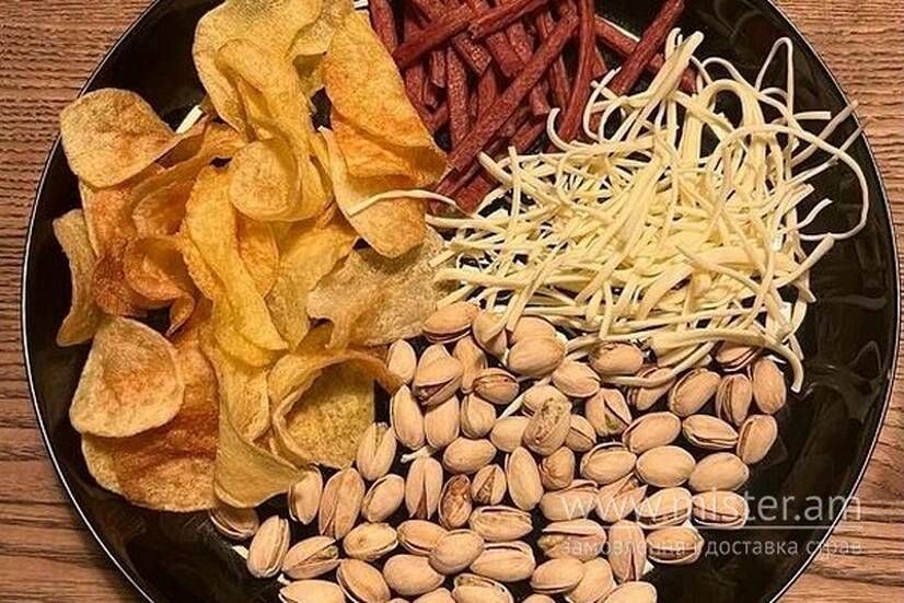 Фісташки, чіпси, сир копчений, м`ясний хмизок.