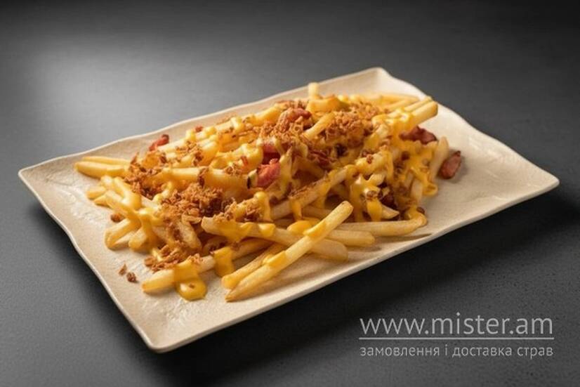 Картопля фрі з беконом під сирним соусом з цибулевими кріспами