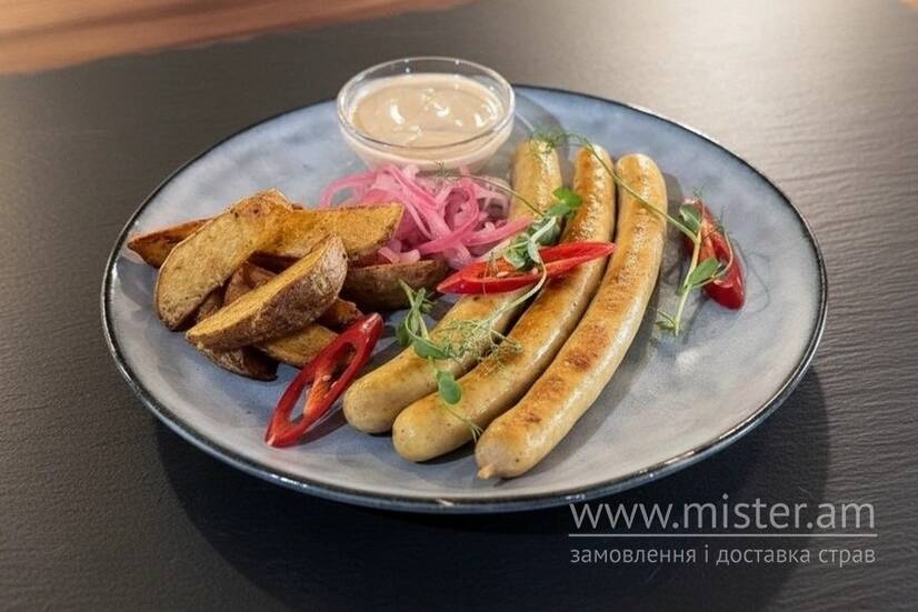 Ковбаски (курка,сир чедр, спеції) подаються з картоплею по-ірландськи, маринованою цибулею та вершково-гірчичним соусом.