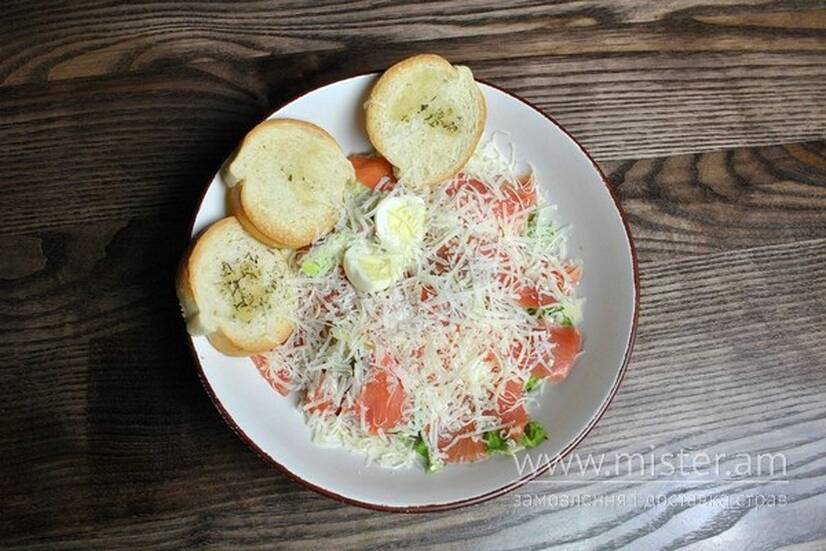 Мікс салат, лосось с/с, помідор, яйце, грінки, пармезан, соус Цезар.