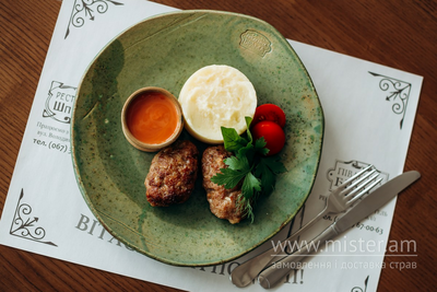 Подаються з картопляним пюре, помідорами чері та соусом.