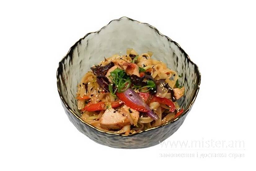 Куряче філе су-від, олія, китайська сіль, капуста, морква, цибуля синя, перець болгарський, гриби муер, рисова локшина, соус WOK, цибуля зелена, кунжут мікс.