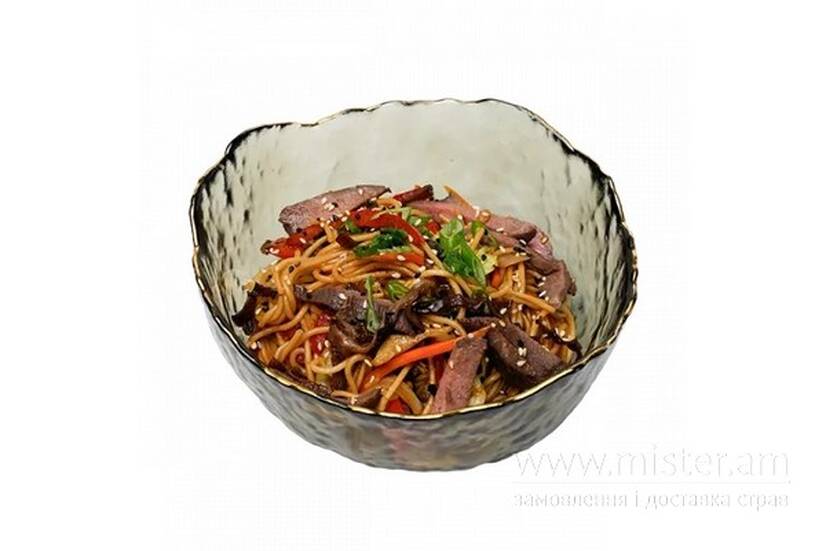 Капуста білокачанна, морква, цибуля синя, перець болгарський, гриби муер, сіль китайська, локшина удон, соус WOK, цибуля зелена, кунжут мікс, телятина су-від.