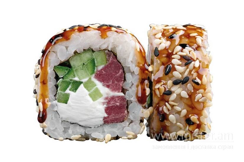 Рис, норі, огірок, cир Філадельфія, тунець, кунжут, соус унагі.