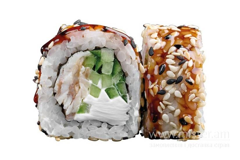 Рис, норі, огірок, cир Філадельфія, вугор, кунжут, соус унагі.